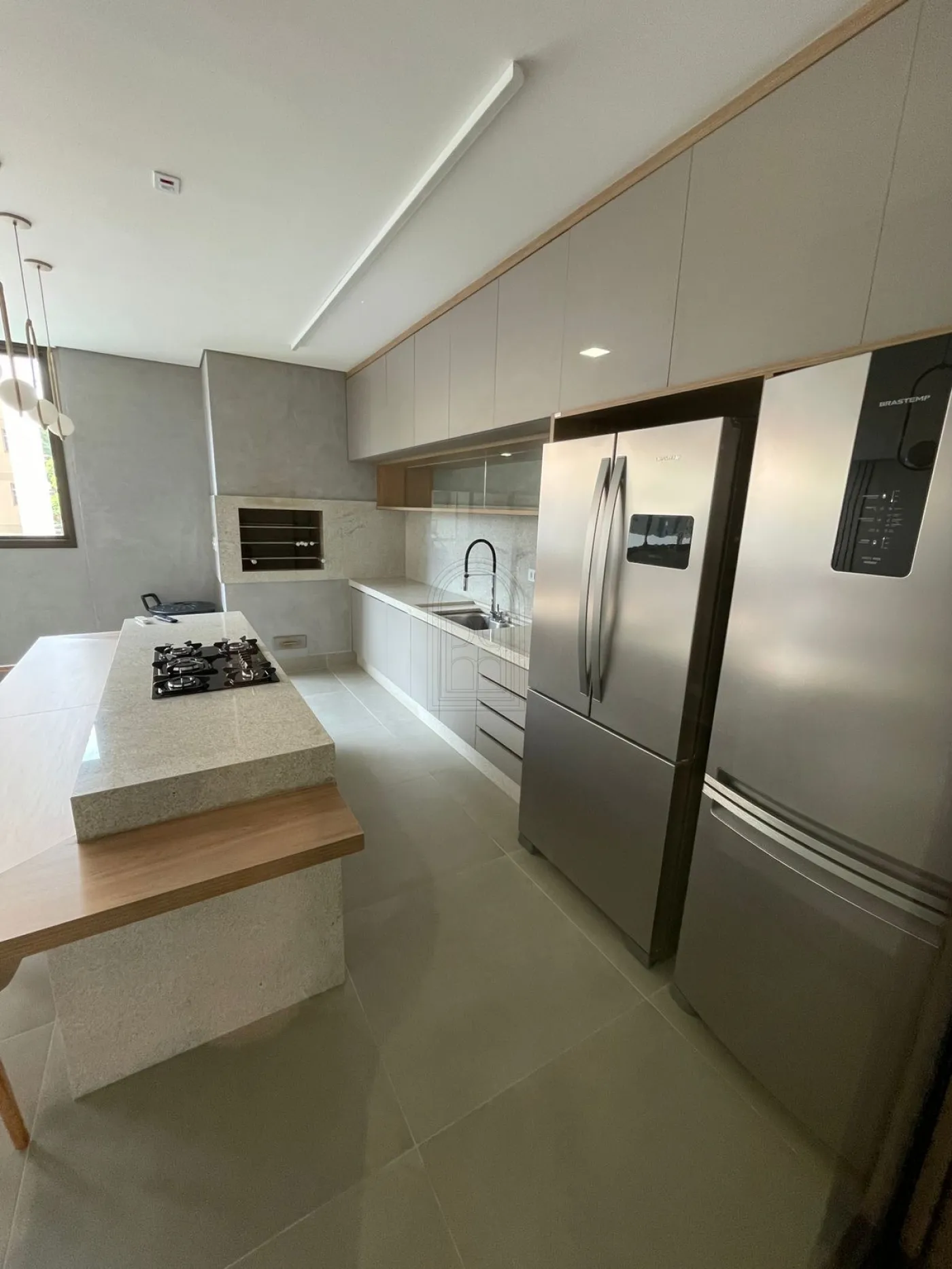Sacada gourmet com churrasqueira a carvão integrada à cozinha