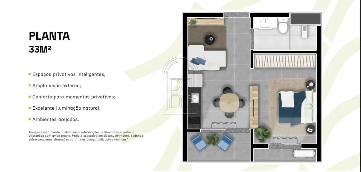 - Configuração: 1 quarto, banheiro, sacada e espaço integrado sala e cozinha.